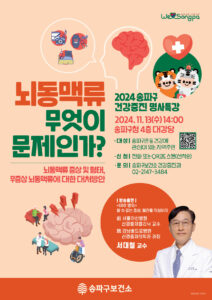 송파구(구청장 서강석)가 일교차 큰 환절기를 맞아 오는 11월 13일 오후 2시 구청 대강당에서 뇌혈관 질환 ‘뇌동맥류’를 주제로 한 ‘건강증진 명사특강’을 개최한다고 알렸다.